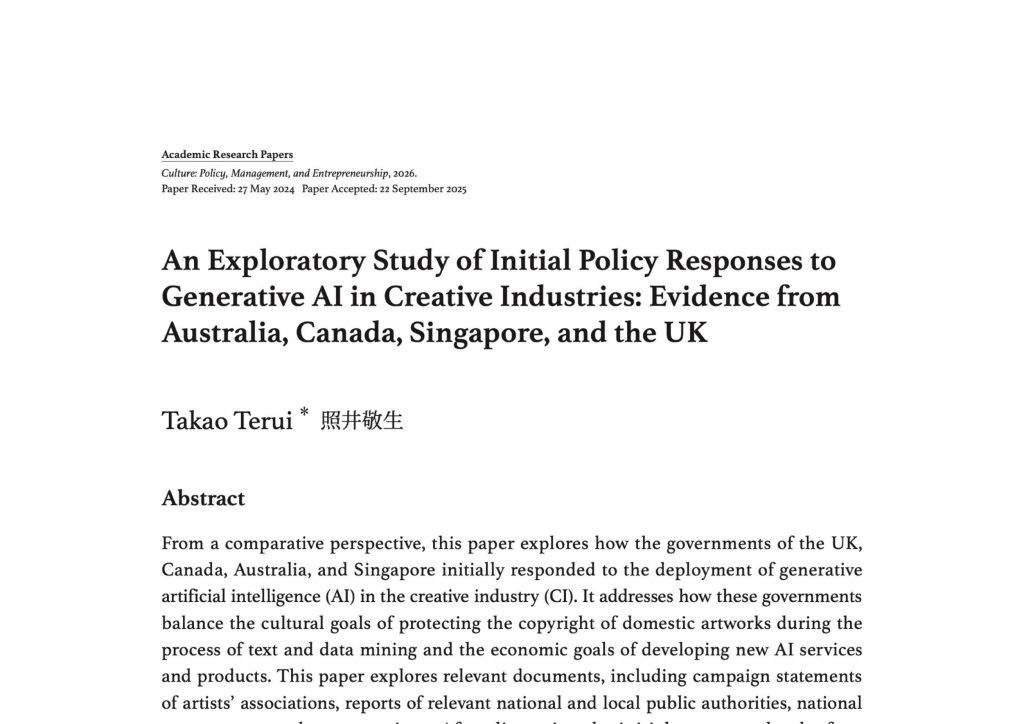 Posted by tacps.tw2026.04.20 2 min read An Exploratory Study of Initial Policy Responses to Generative AI in Creative Industries: Evidence from Australia, Canada, Singapore, and the UK Takao Terui 最新出刊 期刊文章 研究論文 線上新刊 Posted by tacps.tw2026.04.02 1 min read 從委外到共創:古蹟再生協力治理與公共價值實踐 林宜珍 最新出刊 期刊文章 研究論文 線上新刊